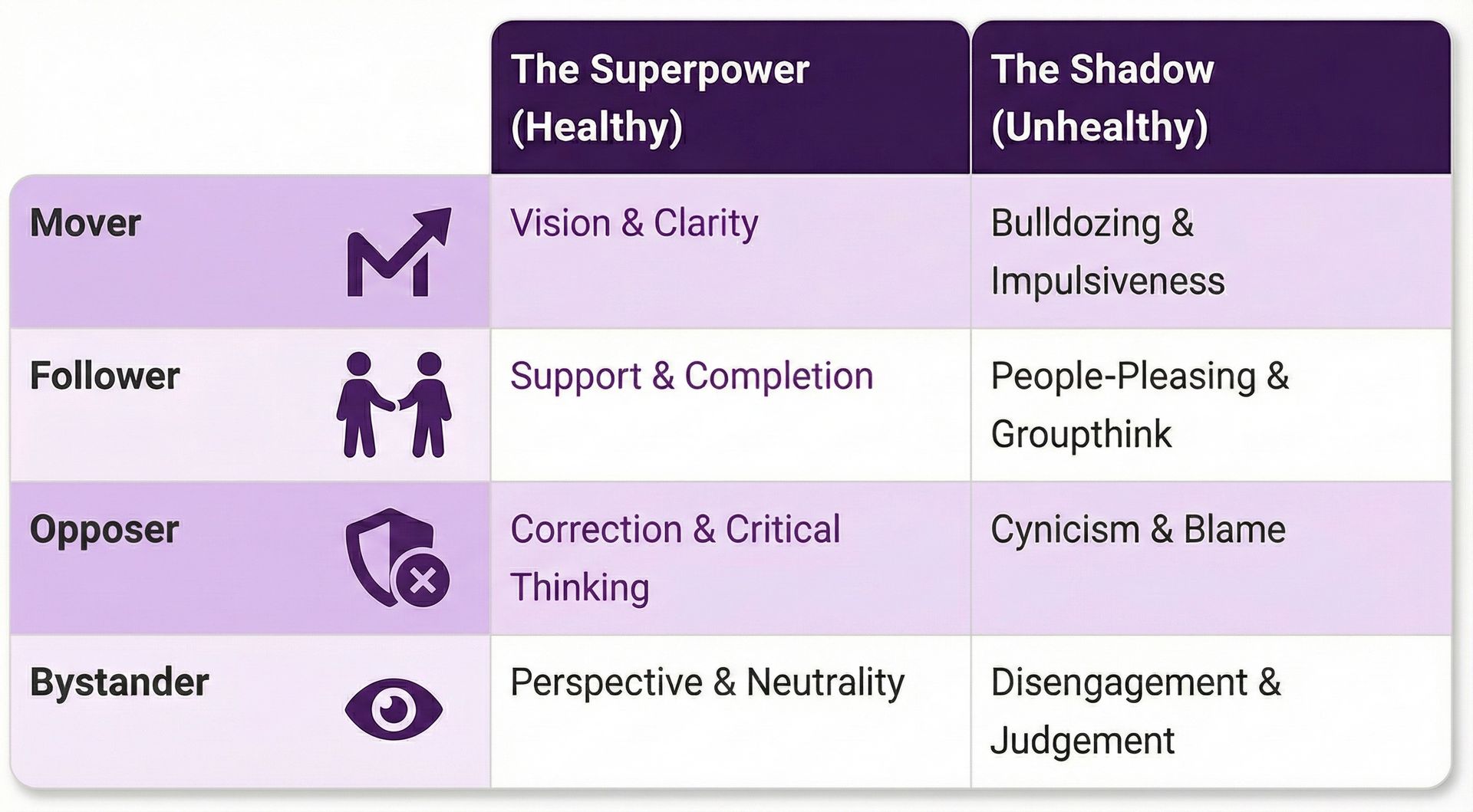 Growth requires leaving your home base. If you are a natural Mover, your growth edge is learning to Follow. If you are a natural Bystander, your growth edge is learning to Move.
